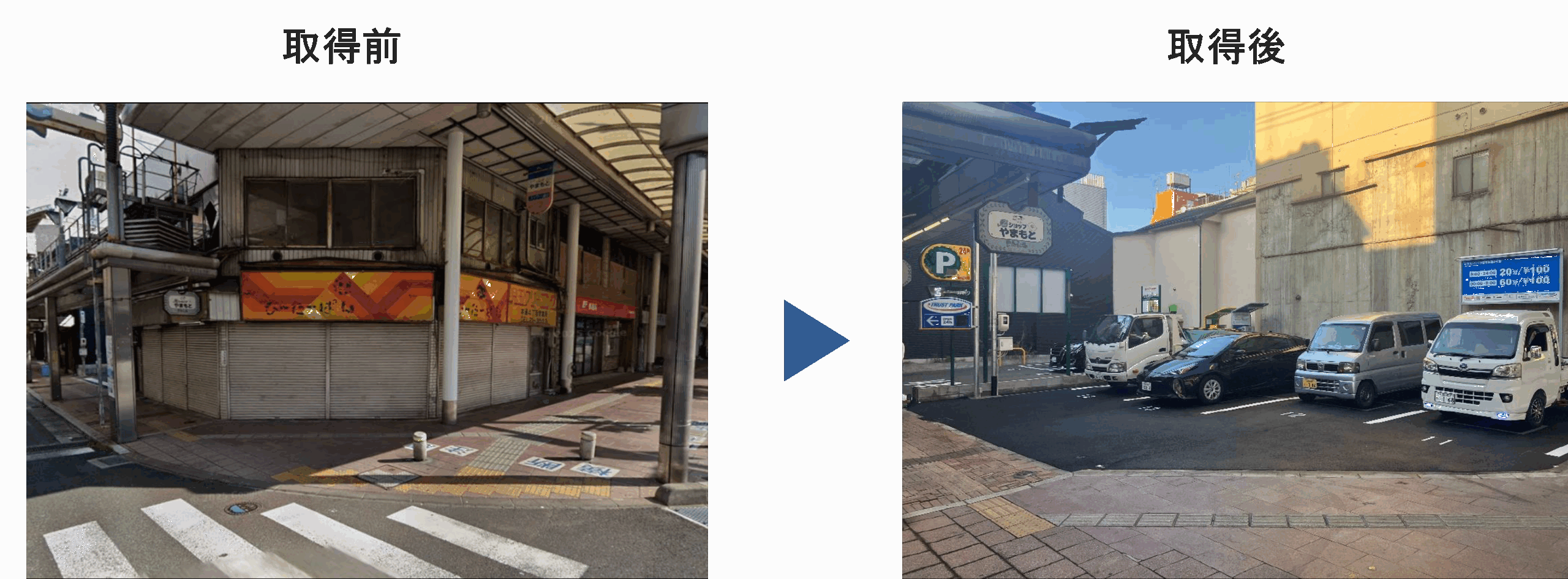 本件土地は、広島県呉市に所在し、数年間空き店舗となっていた物件です。地元の不動産会社様のご協力により、所有者様をご紹介いただいたことをきっかけにご縁をいただきました。当社から土地の立地条件や周辺の駐車需要を基にご提案を行い、所有者様のご意向を踏まえ売買契約を締結いたしました。その後、当社グループにて解体工事を行い、時間貸駐車場として整備・運営管理を開始しました。