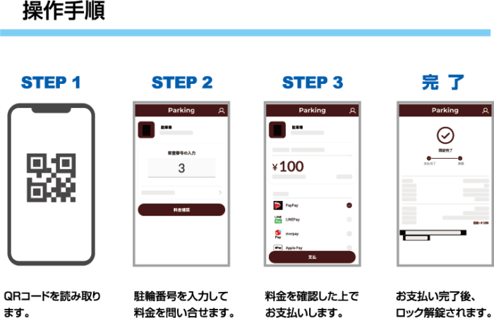 本駐輪場は精算機を設置せず、場内に掲示したQRコードをスマートフォンで読み取ってオンラインで決済すると駐輪したラックが解除される仕組みです。クレジットカード、楽天ペイ、PayPay、Paidy、atoneなど、後払いを含む多彩なキャッシュレス決済に対応しており、利用者にとって簡便かつスピーディーな支払いを実現します。